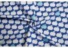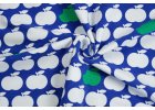 Hravý motív s bielymi a výraznými zelenými jablkami na tmavomodrom podklade. Zloženie: 95 % bavlna, 5 % elastan, gramáž: 240 g/m2, šírka: 150 cm.