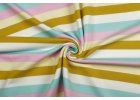 Motív širších pruhov v sviežich pastelových farbách vyladených do harmonického celku. Zloženie: 95 % bavlna, 5 % elastan, gramáž: 260 g/m2, šírka: 150 cm.